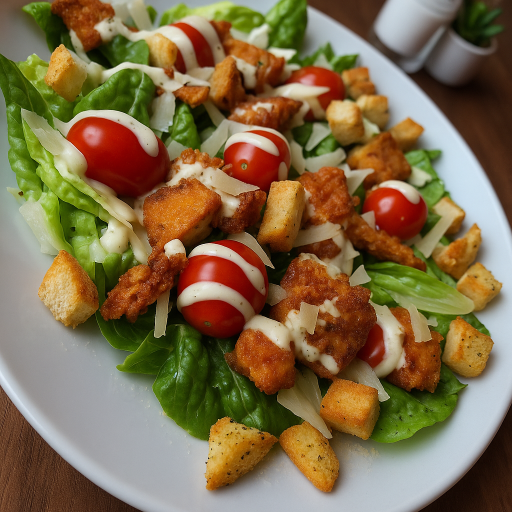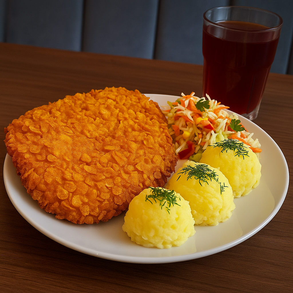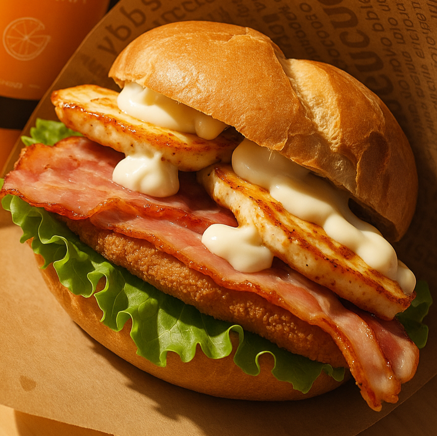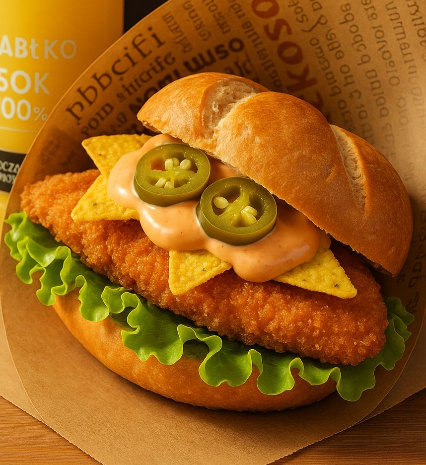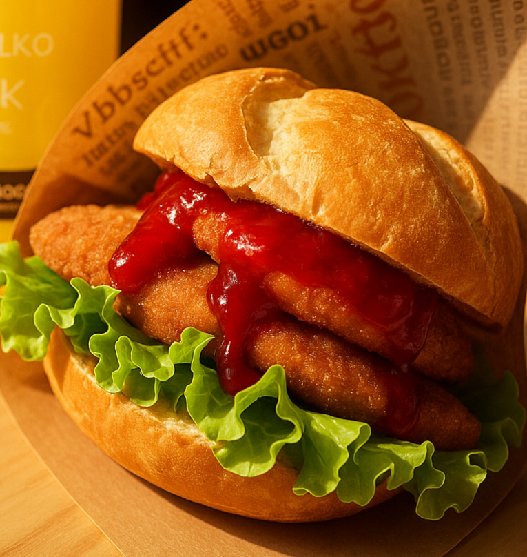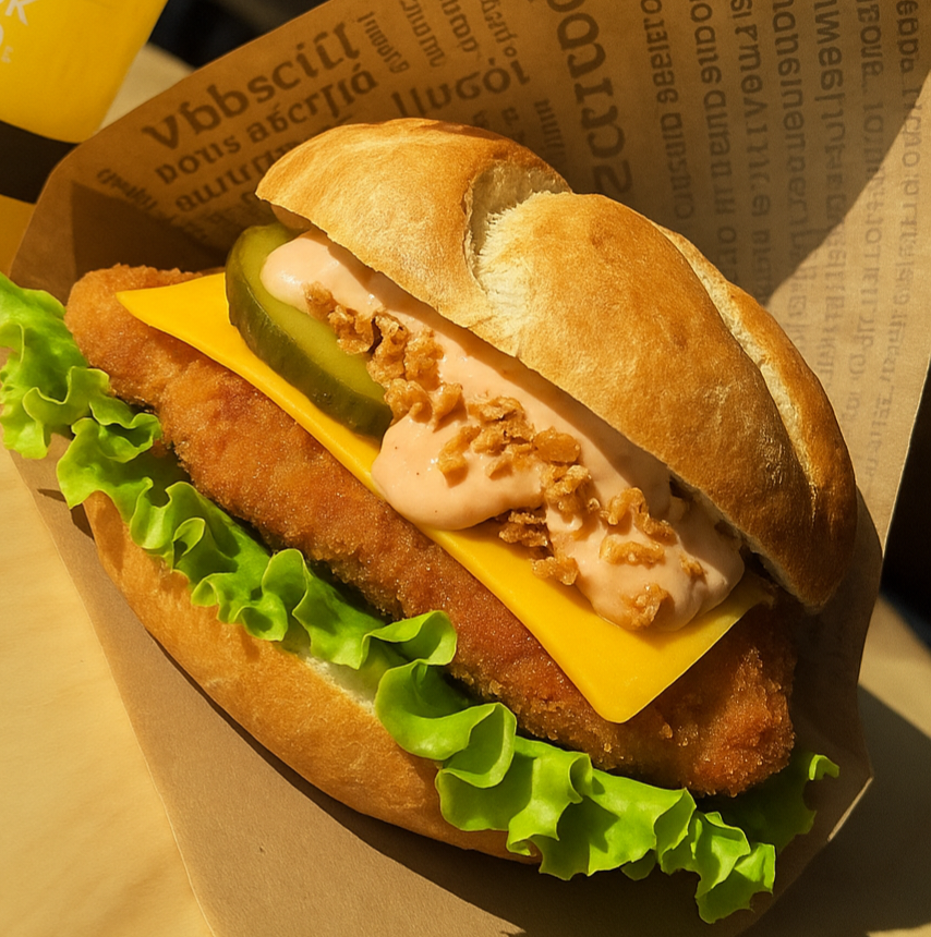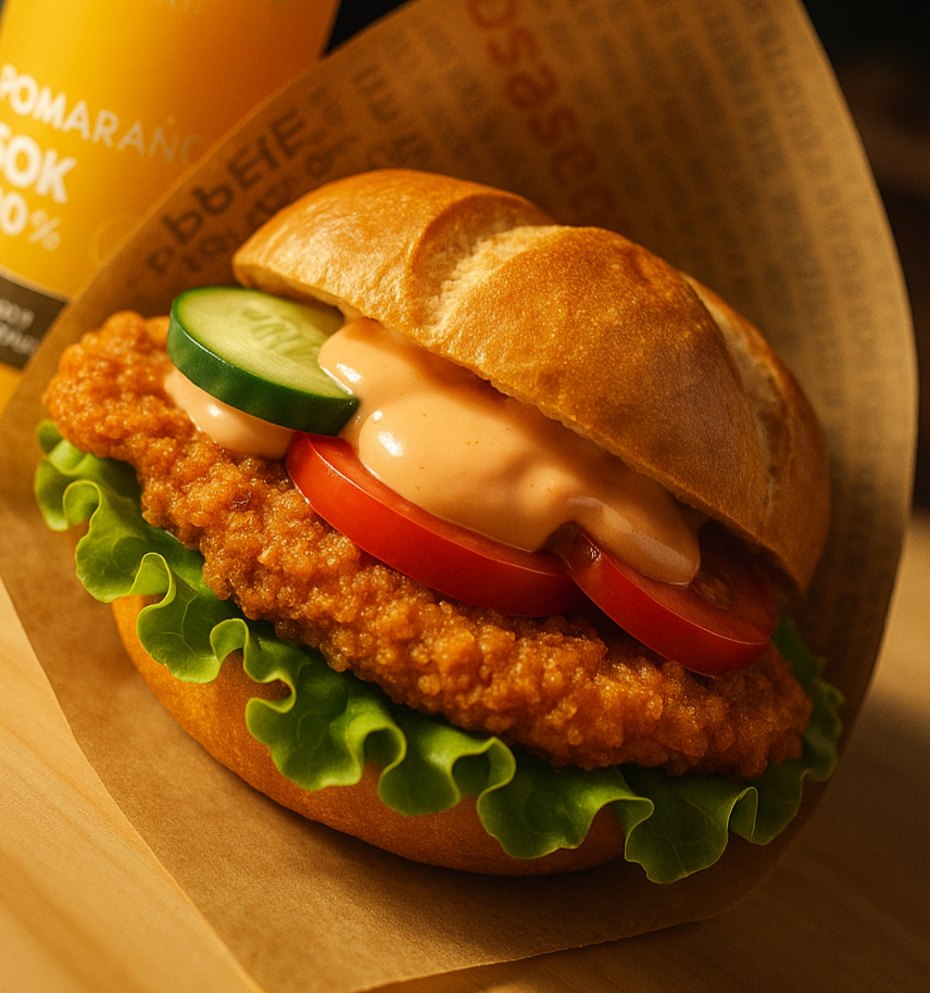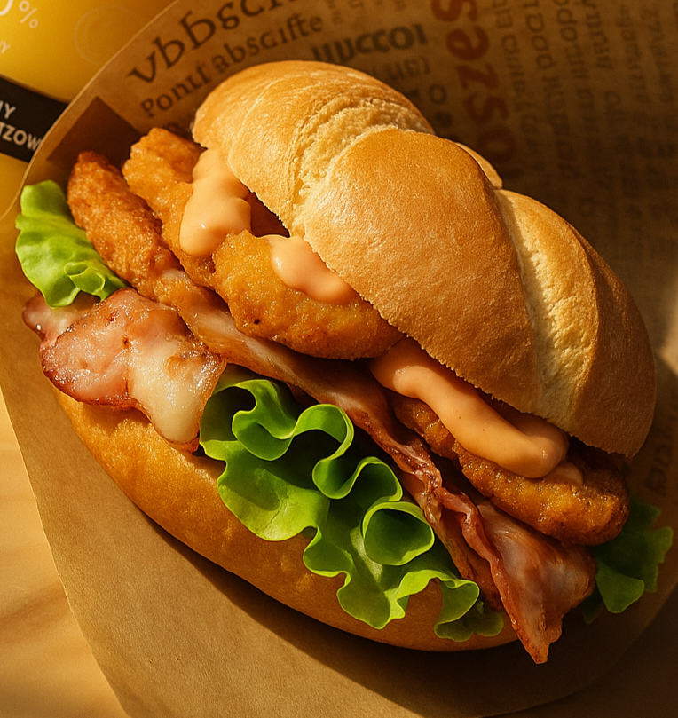 Kajzerka pszenna, sałata, panierowany kurczak, pomidor, świeży ogórek, sos