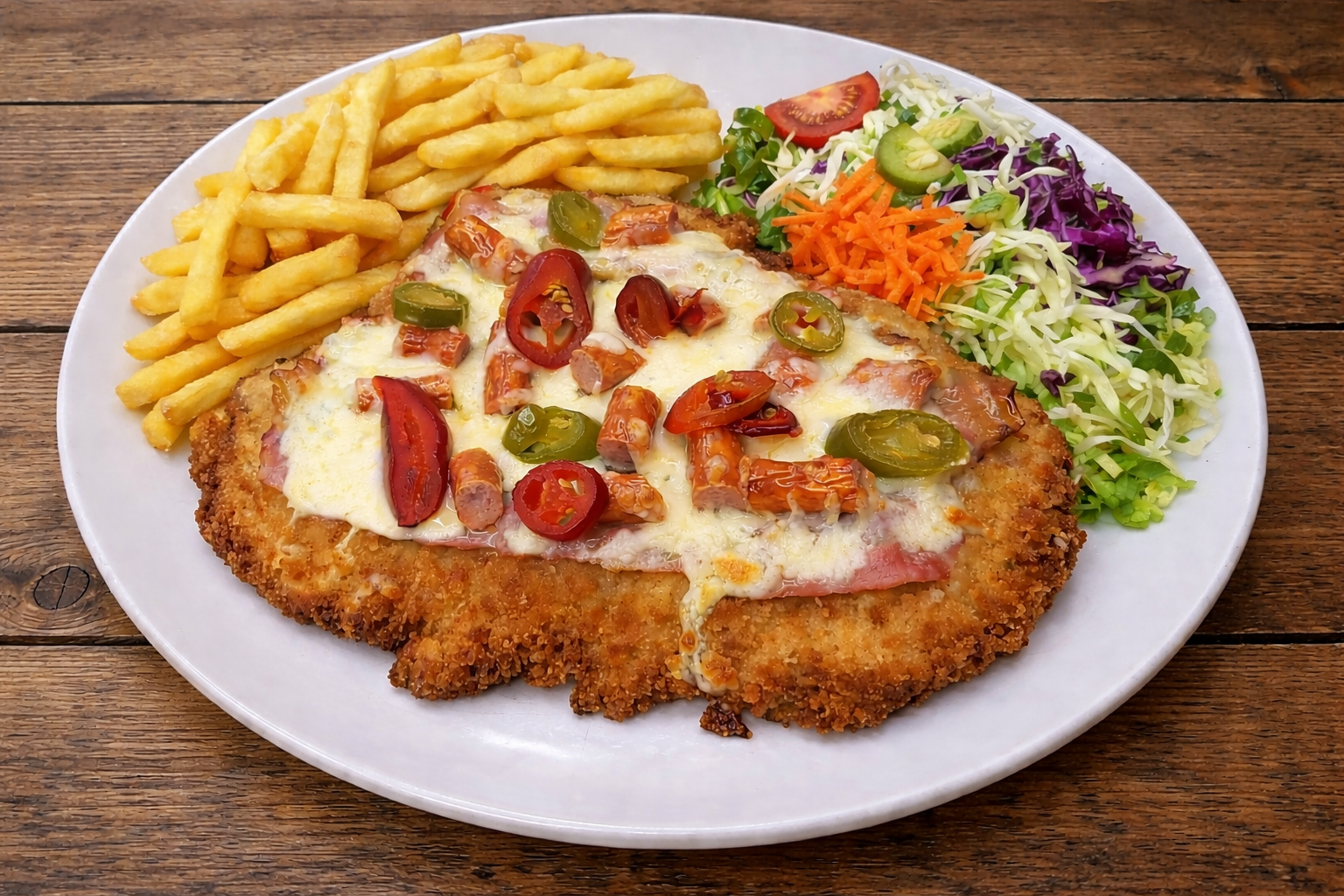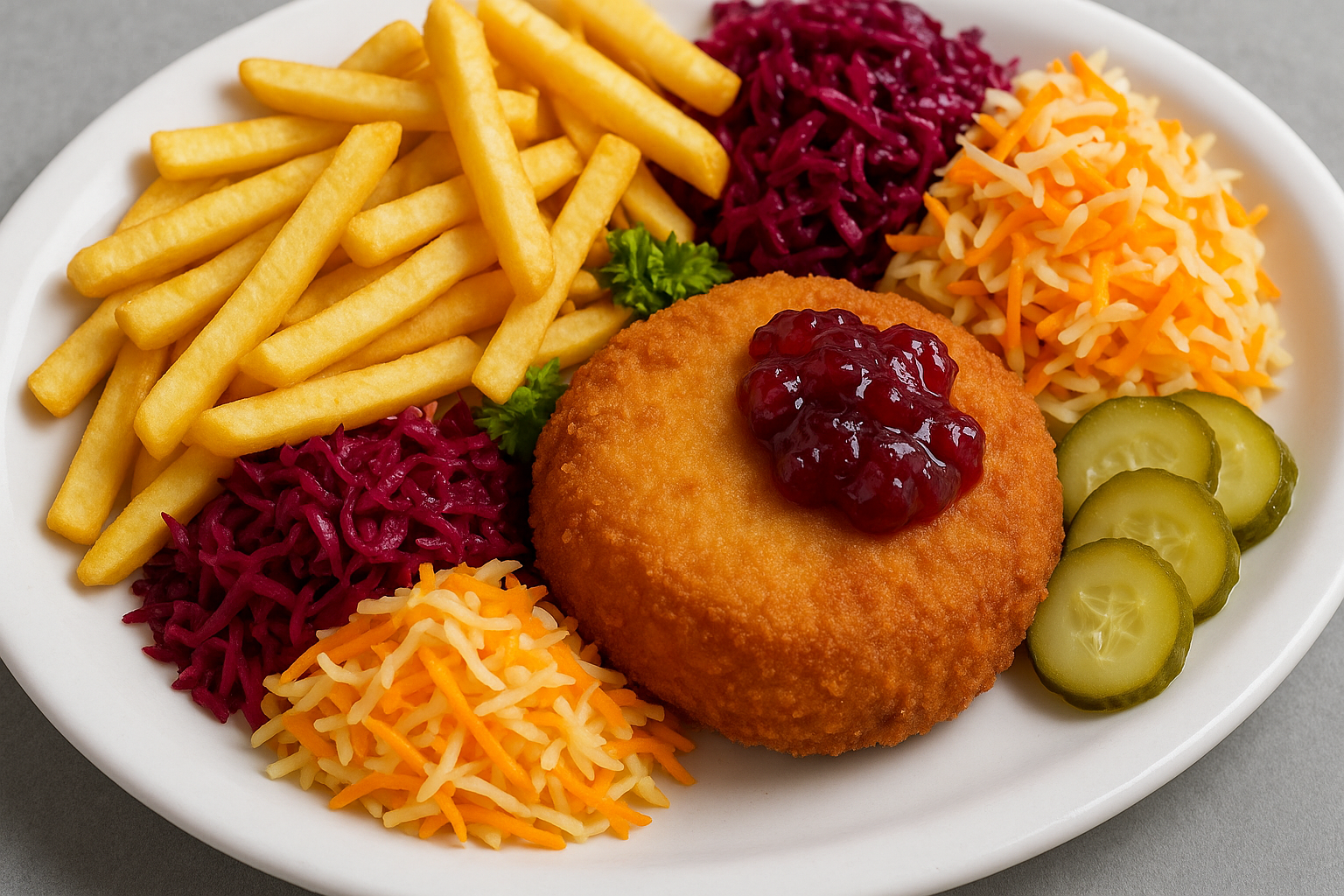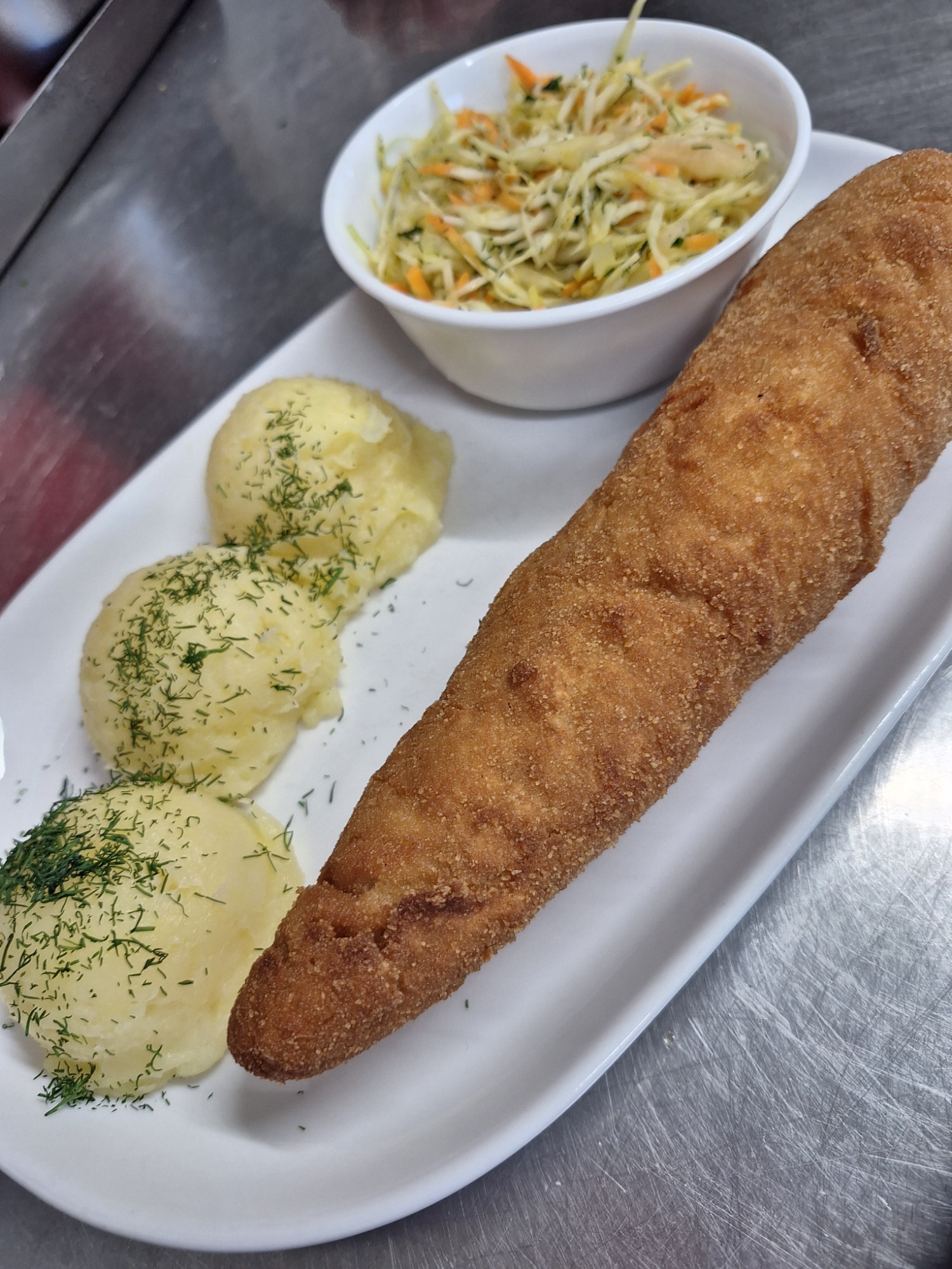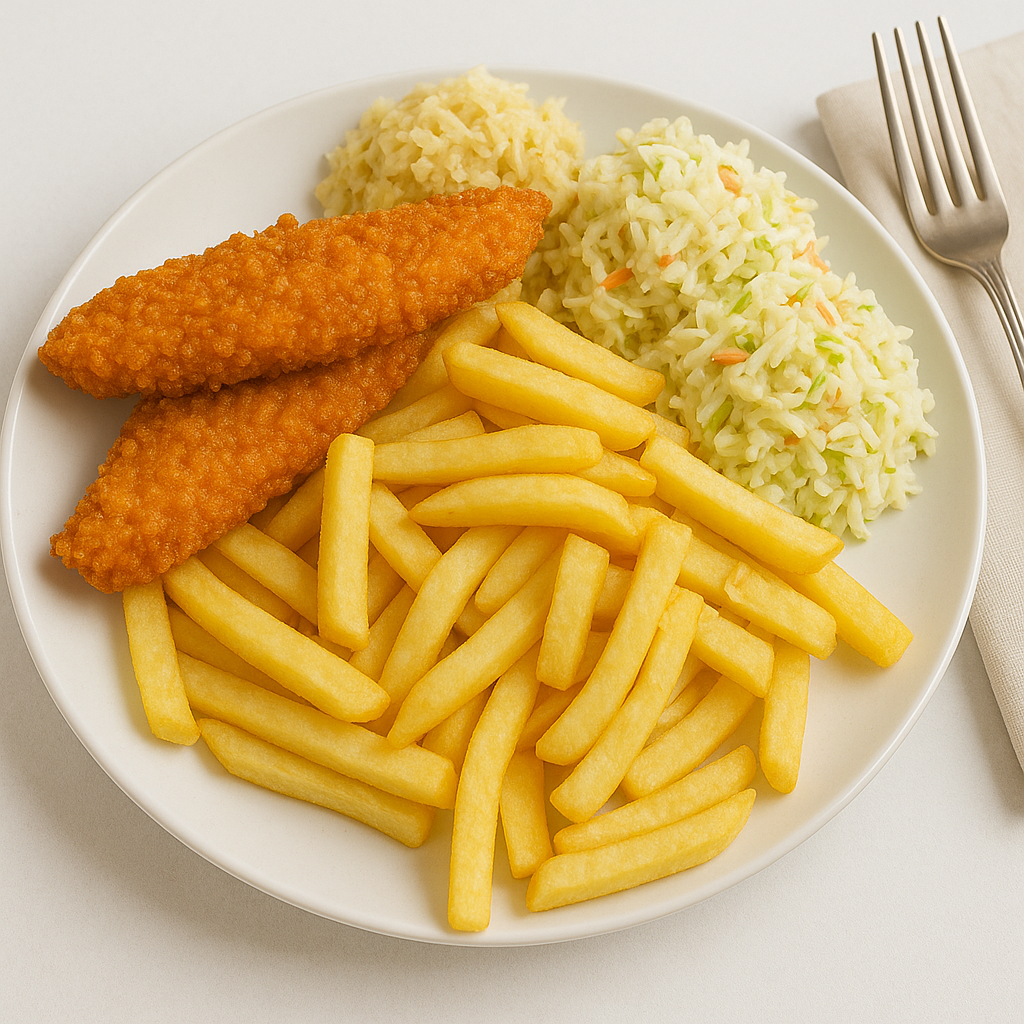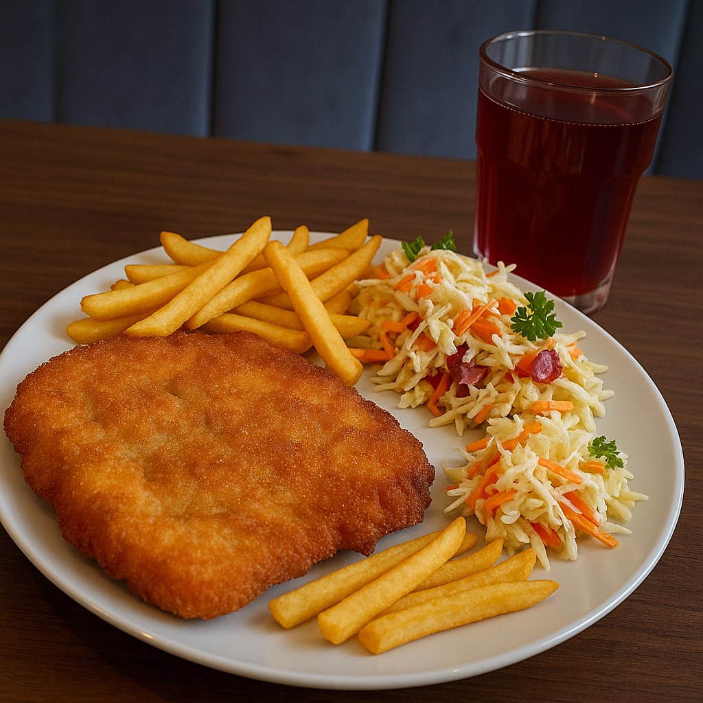 Kajzerka pszenna, sałata, panierowany kurczak, pomidor, świeży ogórek, sos