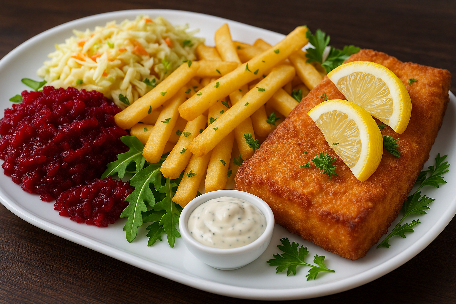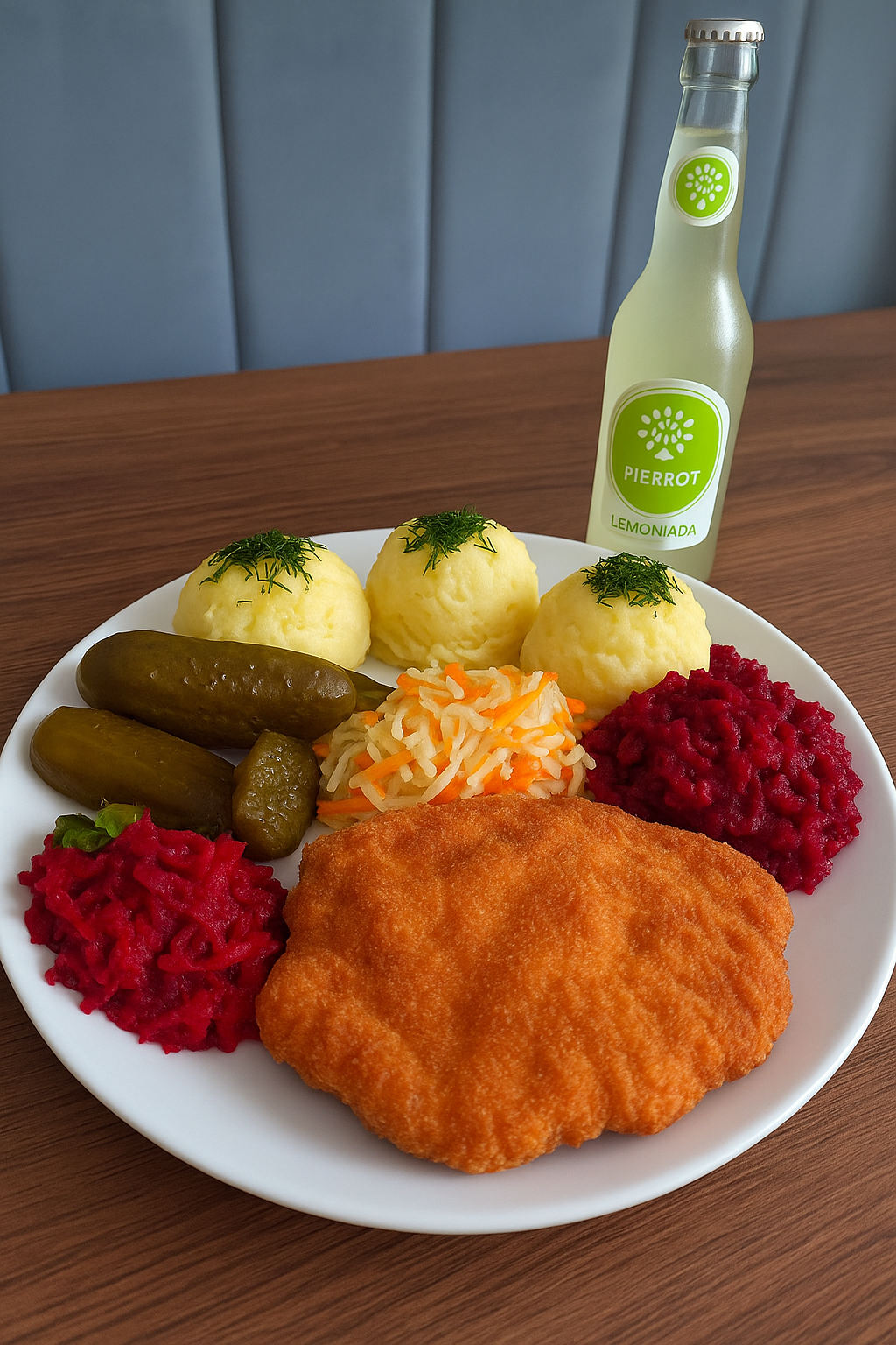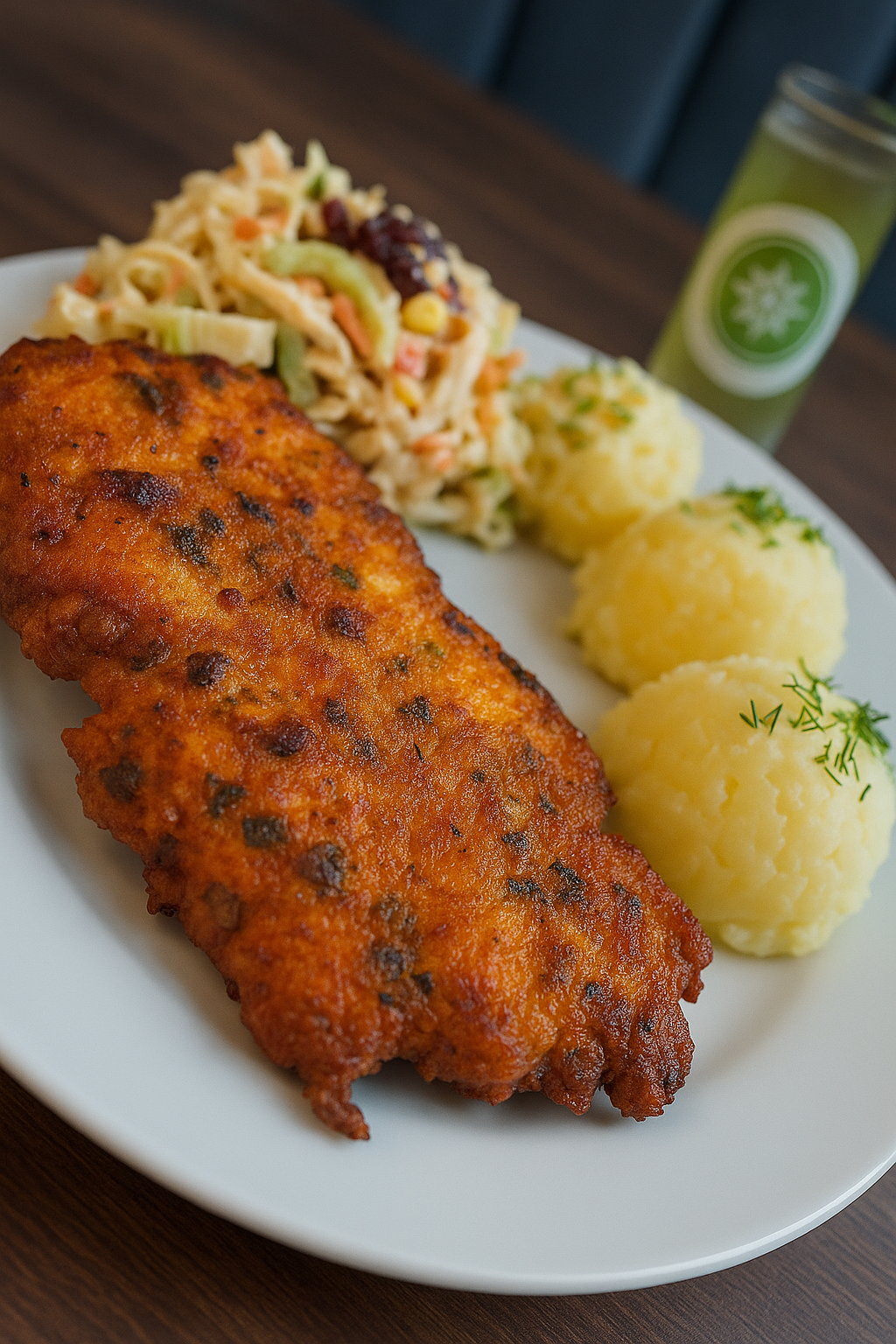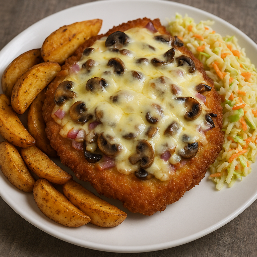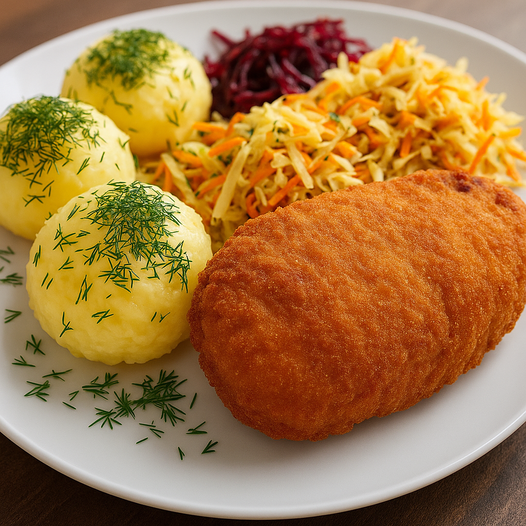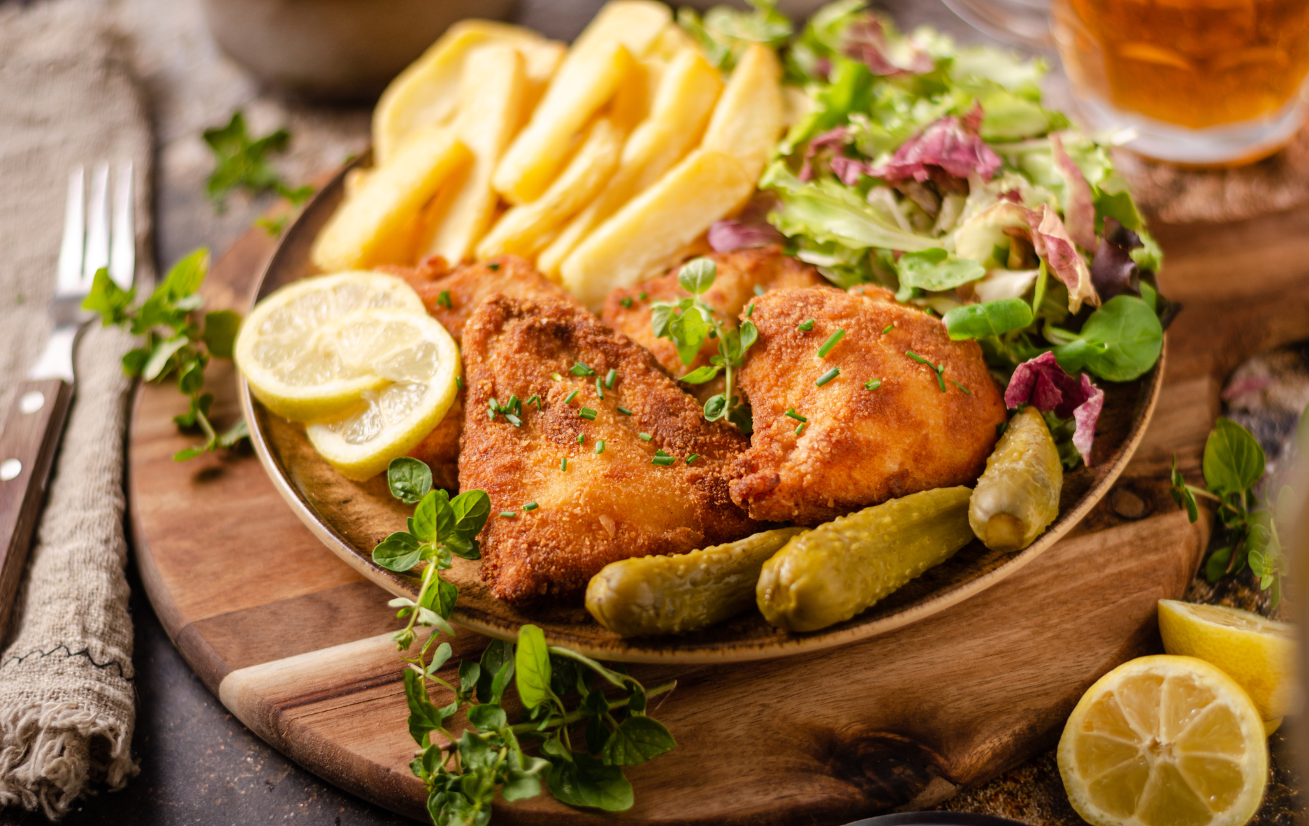 Kajzerka pszenna, sałata, panierowany kurczak, pomidor, świeży ogórek, sos