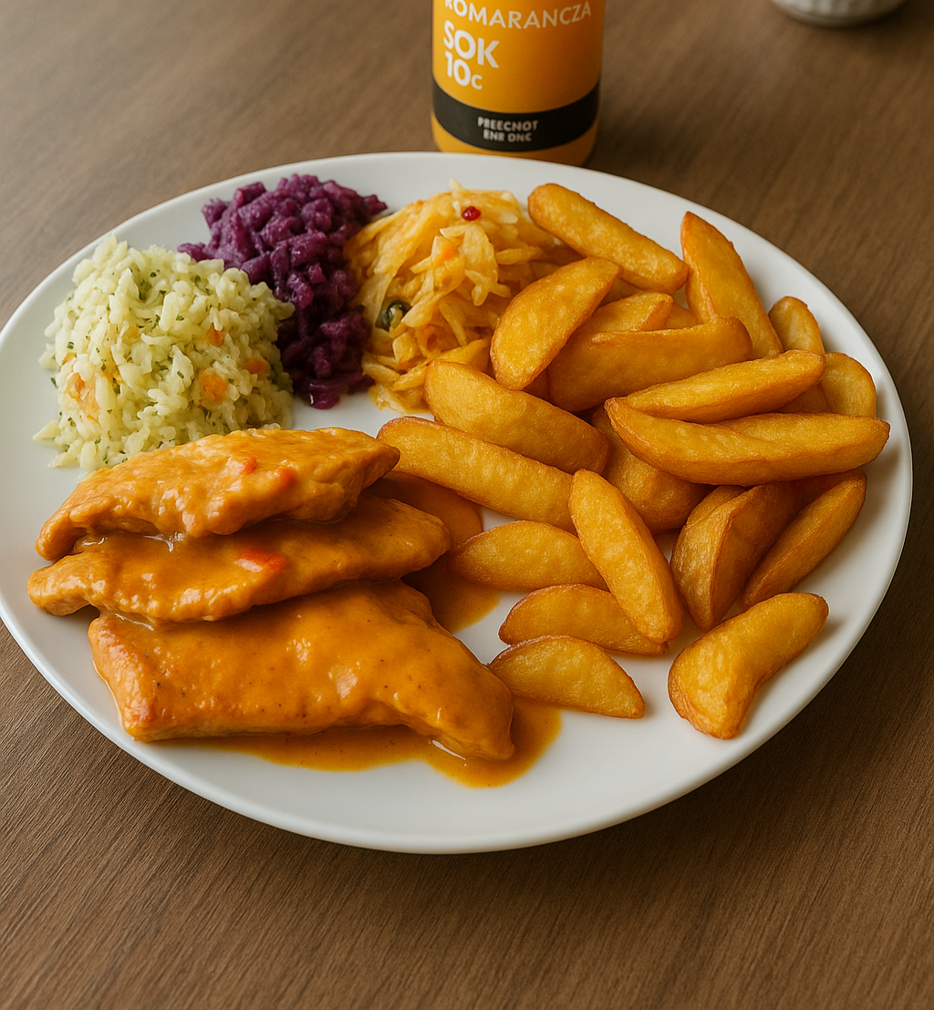 Panierowany filet z kurczaka, podany do wyboru z (puree, frytki, łódeczki) i surówką